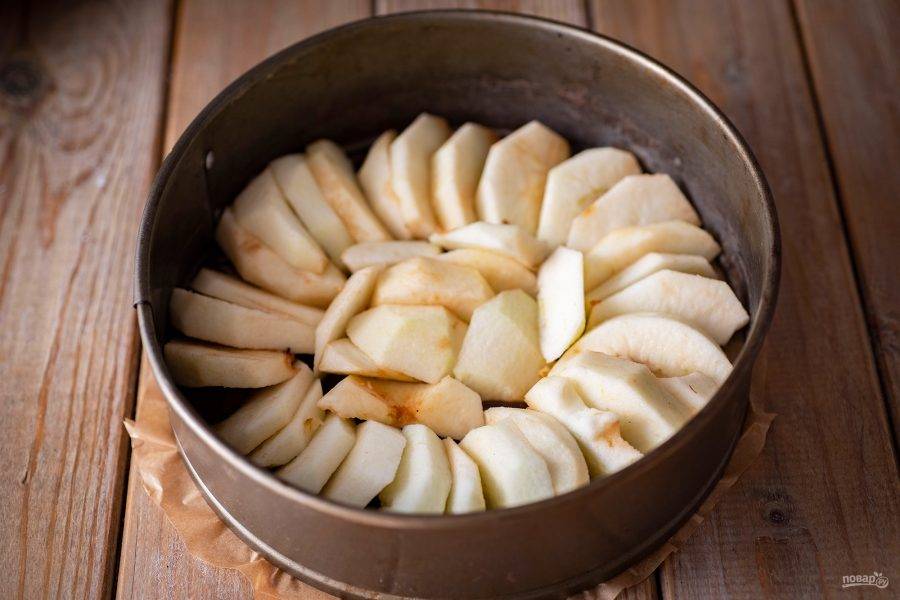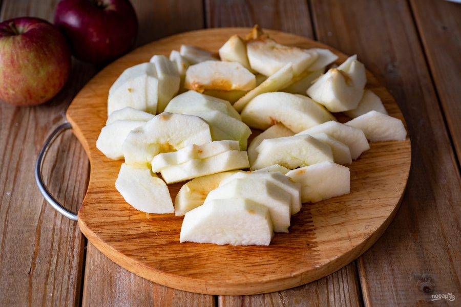 Яблоки почистите от кожуры, удалите семена, нарежьте мякоть крупными ломтиками.