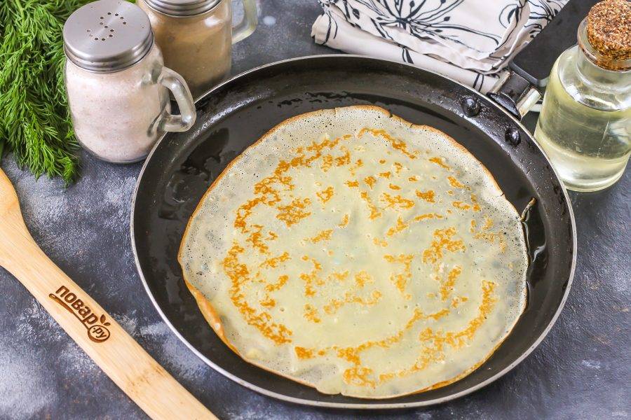 Смажьте сковороду в первый раз растительным маслом и вылейте на нее часть теста, очерчивая круг. Испеките блин по минуте с каждой стороны до румяности.