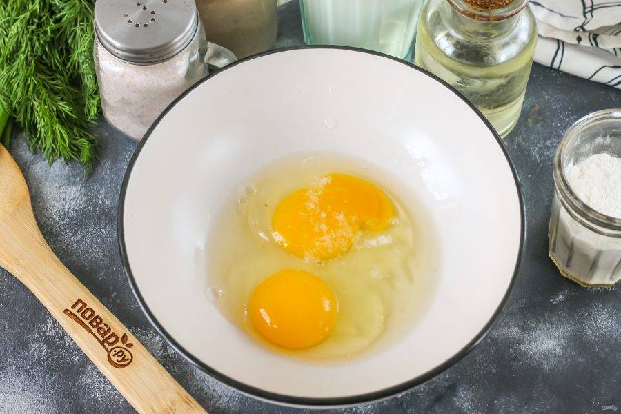 Куриные яйца вбейте в глубокую емкость, всыпьте туда же соль и тщательно взбейте вилкой или венчиком примерно 2-3 минуты.