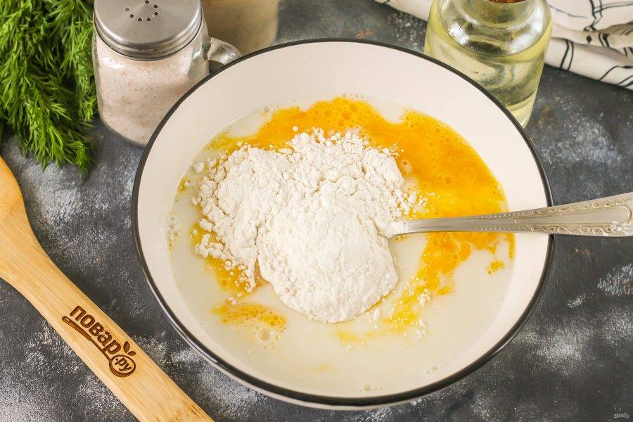 Влейте молоко, всыпьте пшеничную муку и аккуратно замесите блинное тесто.