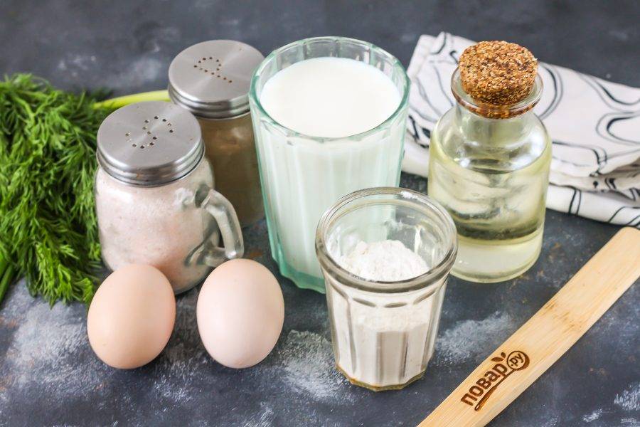 Подготовьте указанные ингредиенты. Тесто для блинов можно сделать как на молоке любой жирности и сорта, так и на воде, кефире, ряженке.