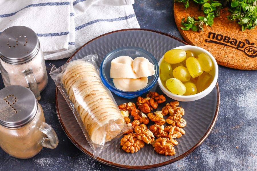 Ядра грецких орехов выложите в тарталетки после винограда. По желанию их можно измельчить и всыпать на тарталетки крошку либо заменить фундуком, арахисом и другими орехами.