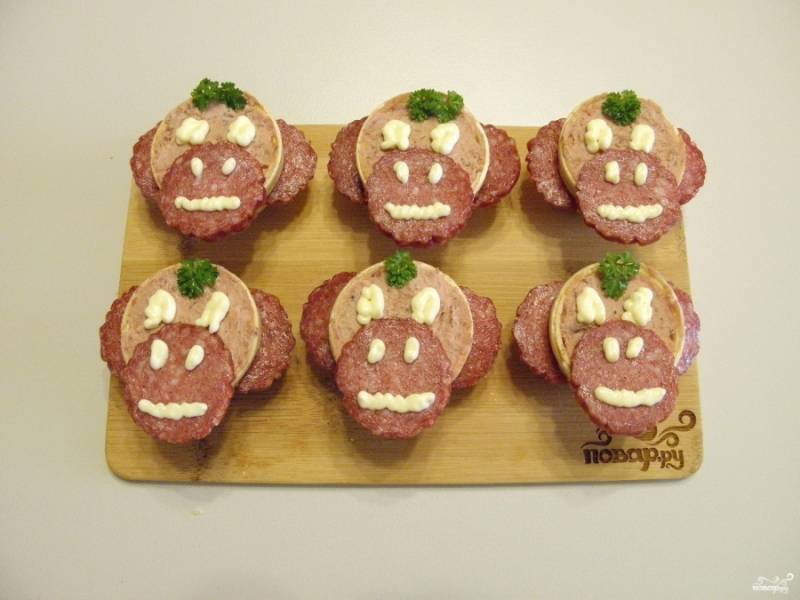 И последний штрих: майонезом нарисуйте глаза, рос и рот. Мордашки обезьянок готовы!