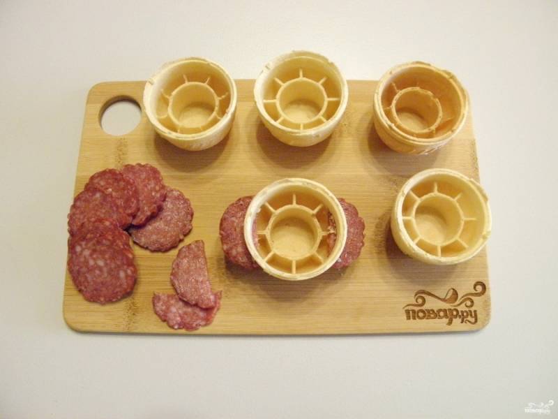 Подготовьте тарталетки. Колбасу порежьте колечками. Хорошо, если колбаса тонкая, как раз получаются нужного размера ушки. Каждое колечко порежьте на половинки. В каждой тарталетке ножом сделайте надрезы по бокам и вставьте ушки. как на фото.