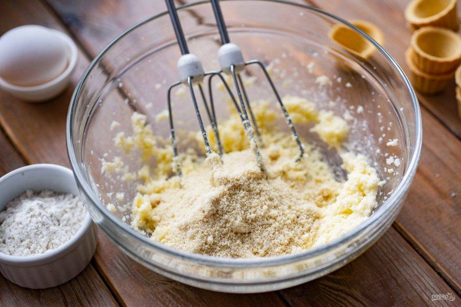 К этой кремообразной масляной массе добавьте миндальную муку. Миксером на маленьких оборотах вмешайте муку до получения однородной массы.