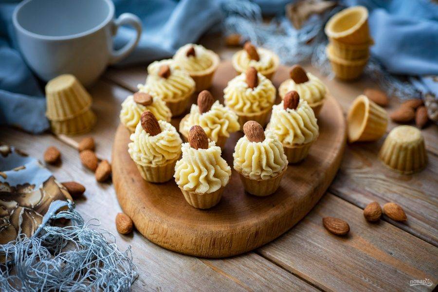 В подготовленные тарталетки отсадите франжипан, я еще украсила верхушки орешками миндаля, но это по желанию. Подавайте к столу.