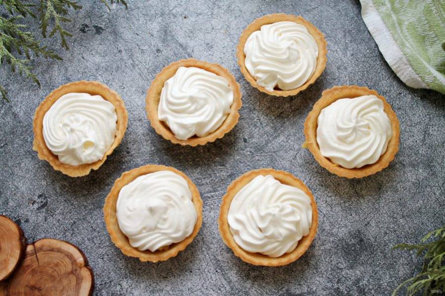 Сливки взбейте с сахарной пудрой в пышную массу. Переложите сливки в кондитерский мешок с насадкой звездочка и отсадите поверх фруктов. Украсьте тарталетки фруктами и подавайте к столу.