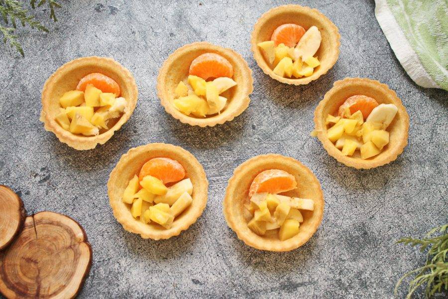 Мандарины почистите и разделите на дольки, удалите пленки, мякоть манго порежьте кубиком, бананы очистите и разрежьте на кусочки. Разложите фрукты по тарталеткам.