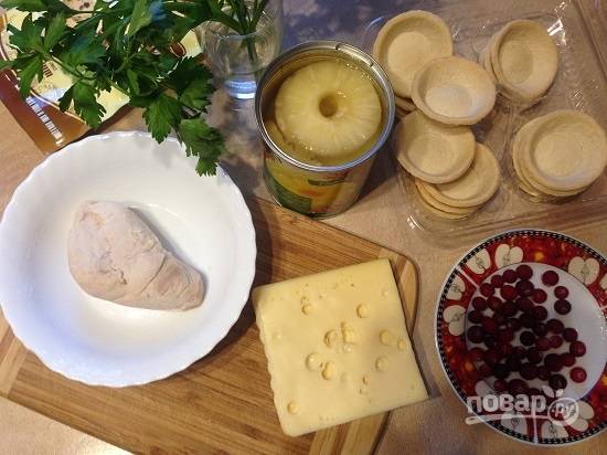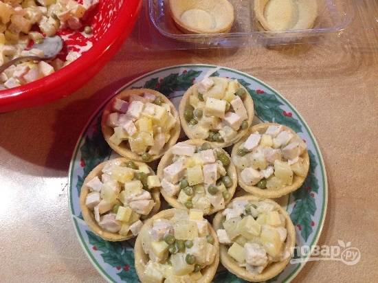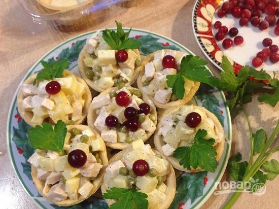Рецепт, как приготовить салат с курицей и ананасами в тарталетках, отлично подойдет к любому праздничному столу. Подача блюда в тарталетках намного интересней, чем обычная подача в салатнике.