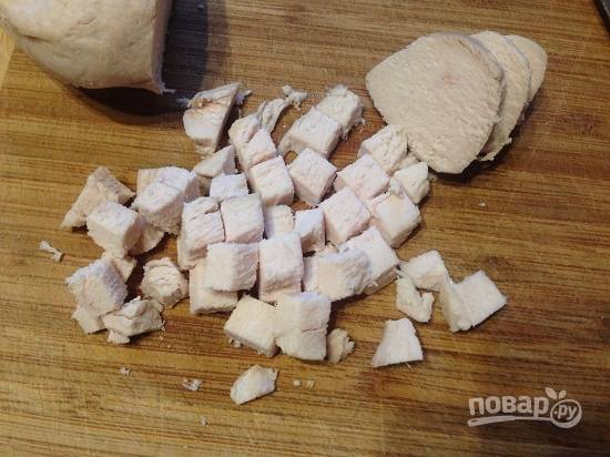 Для приготовления этого блюда все ингредиенты у нас уже готовы. Куриное филе отварили и остудили заранее? Варится оно быстро - 20 минут после закипания.