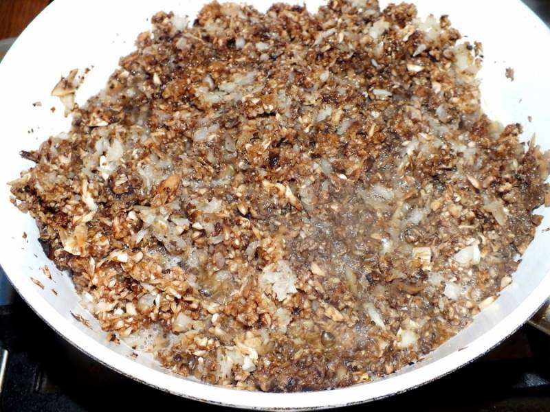 1. Грибы и лук моем и чистим. Измельчим их в блендере и обжарим на растительном масле, пока не уйдет лишняя жидкость и лук не станет золотистым.