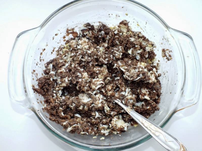 3. Грибную смесь добавляем сюда же. Добавим также майонез, все тщательно перемешаем. Для красивого вида этот паштет прокрутите в блендере еще раз. Фаршируем отправляем в духовку тарталетки.