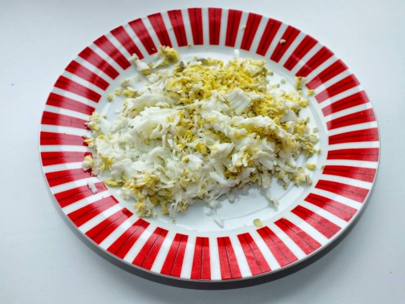 2. Яйца отварим и остудим. Трем на терке сырки и яйца, перемешиваем между собой.