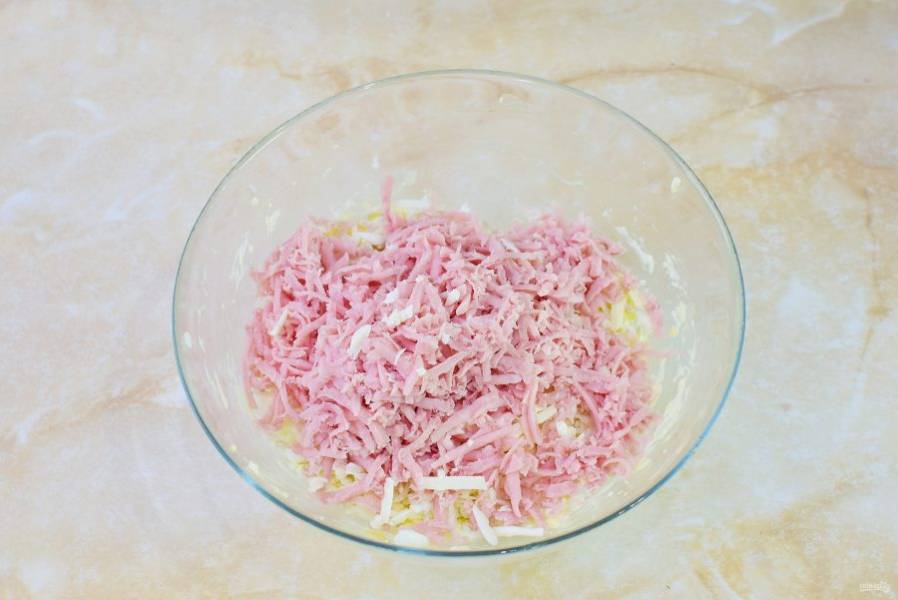 Следом потрите ветчину. Можно её просто мелко порезать.