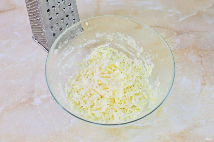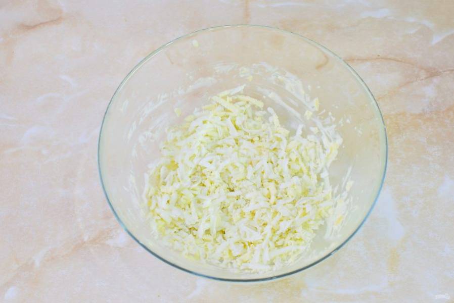 В чашу потрите на терке отварные яйца.