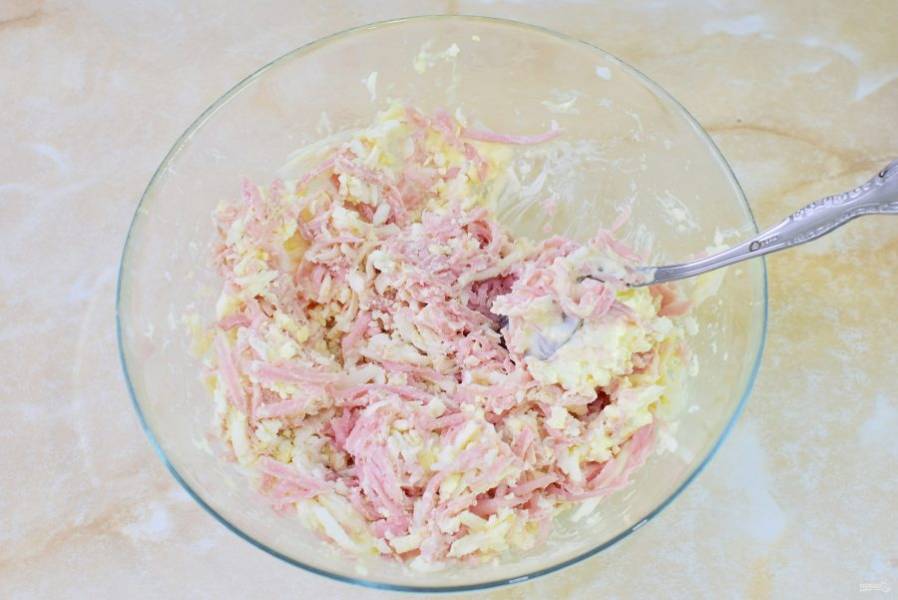 Добавьте в чашу майонез и все ингредиенты тщательно перемешайте до получения однородной консистенции.