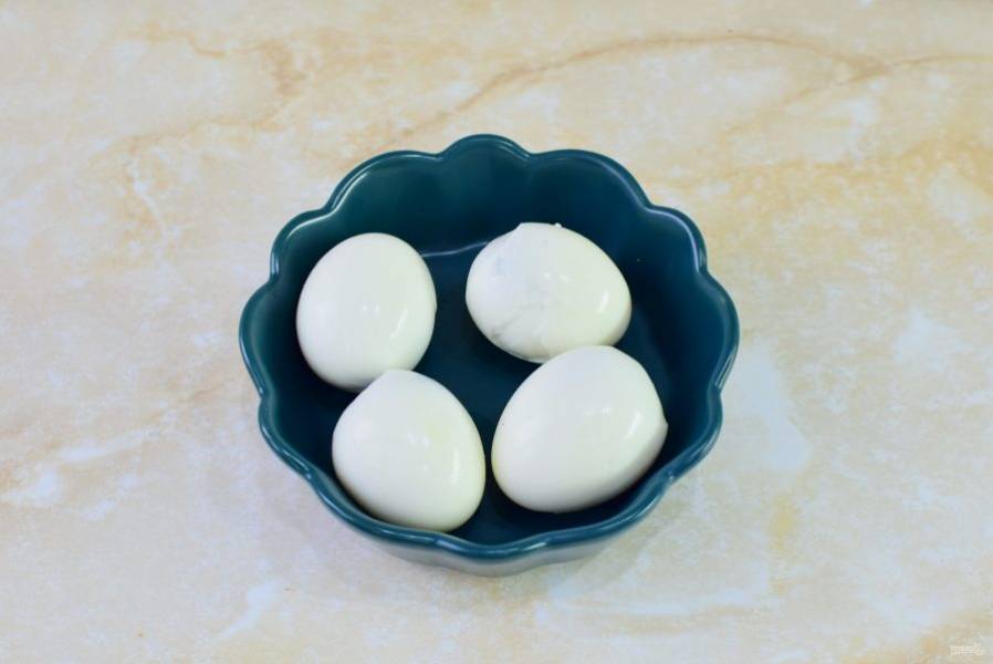 Яйца отварите в кипящей воде 7-10 минут. Затем горячую воду слейте и остудите яйца в холодной воде. Остывшие яйца очистите от скорлупы.