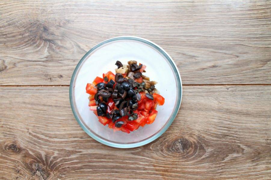 Каперсы достаньте из рассола, порежьте и добавьте в миску с овощами.