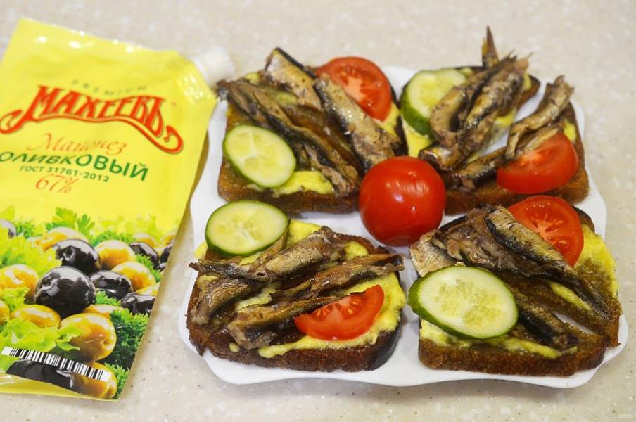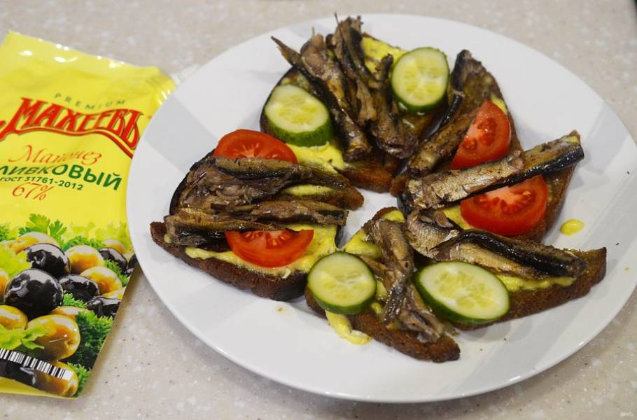6. На каждый кусочек хлеба выложите 1-2 рыбки.