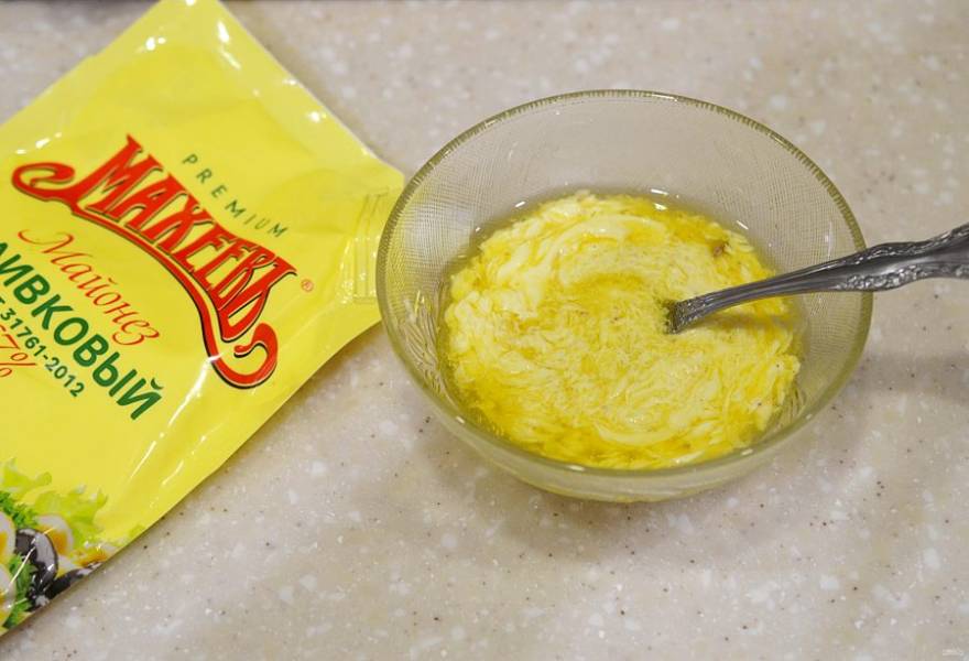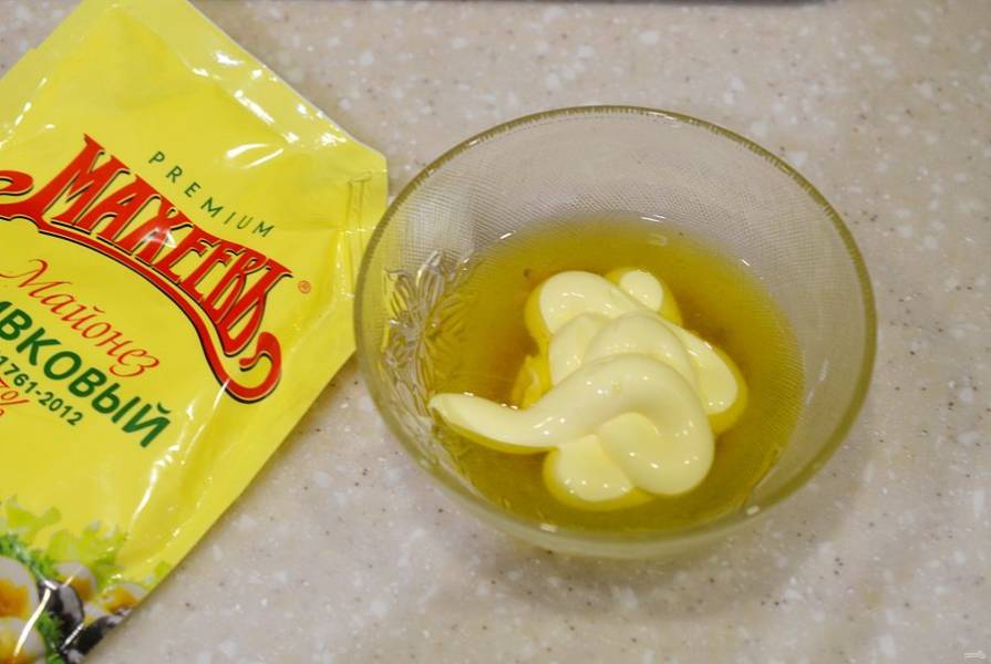 3. Со шпрот слейте в мисочку масло, добавьте майонез МахеевЪ.