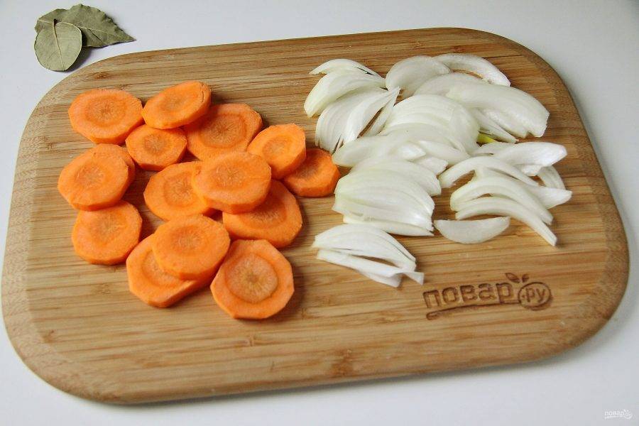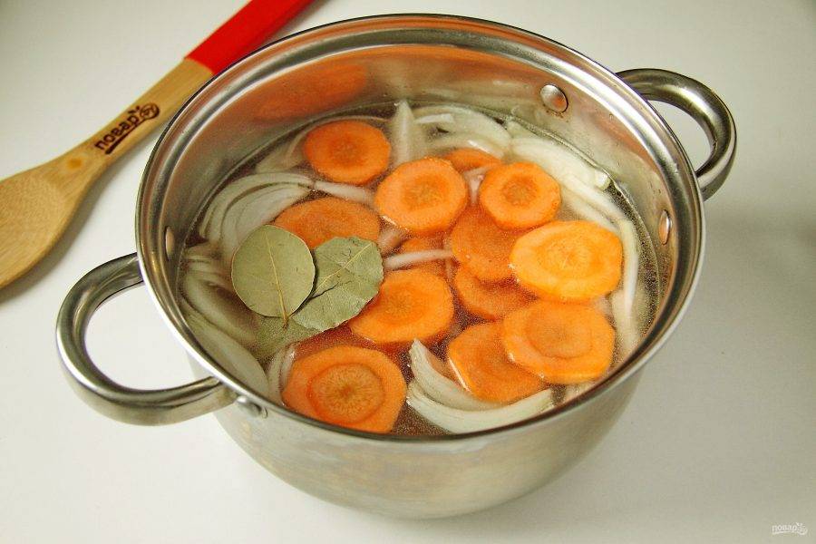 Добавьте лук, морковь, лавровый лист и нарезанное порционными кусками вареное мясо. Варите бульон с мясом и овощами 30 минут.