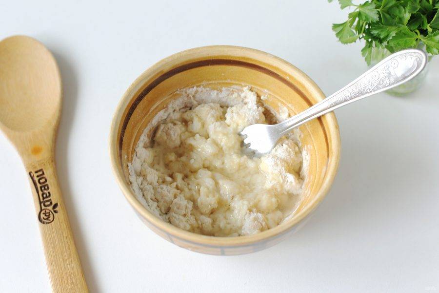 Добавьте яйцо и соль по вкусу, чтобы клецки не получились пресные.