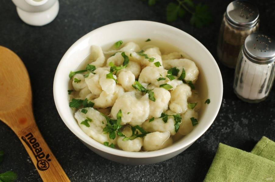 Разложите клецки по тарелкам и подавайте к столу. Бульон можно подать как вместе, так и отдельно. Приятного аппетита!