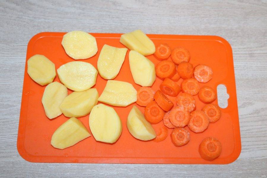 Извлеките курицу из бульона. В кипящий бульон добавьте нарезанный картофель и морковь.