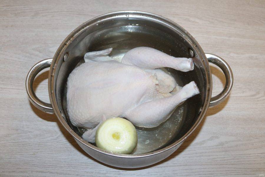 Курицу промойте, положите в большую кастрюлю, залейте водой, добавьте целую луковицу, поставьте на плиту, доведите до кипения, сделайте медленный огонь, посолите по вкусу. Варите 60-80 минут до готовности.
