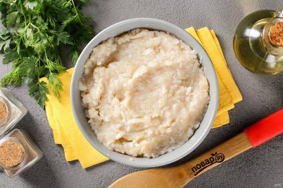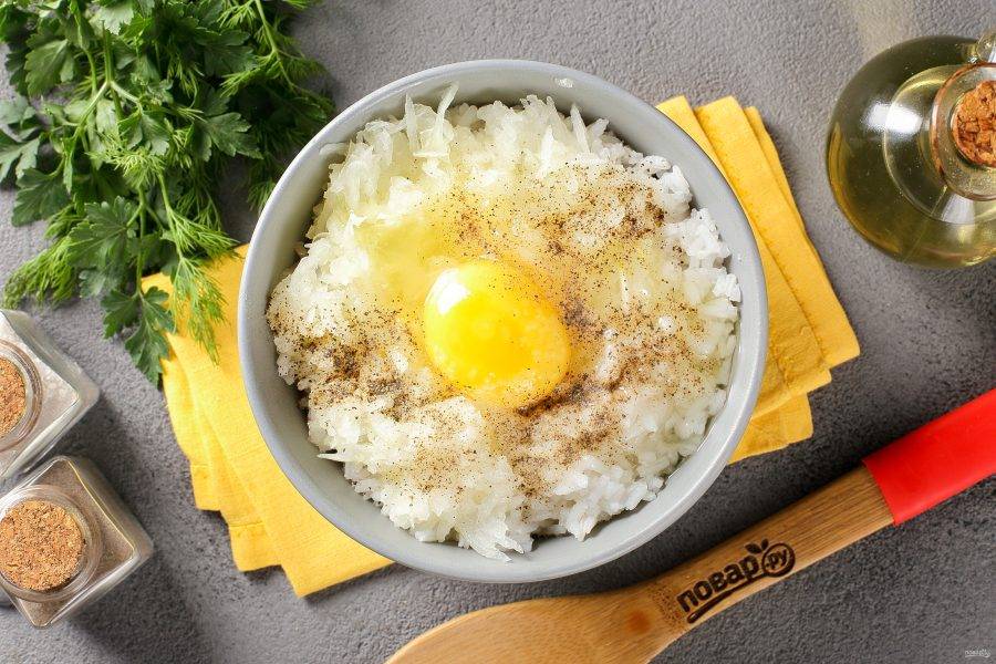 Добавьте рис, тёртый на крупной тёрке лук, яйцо, соль и специи по вкусу.
