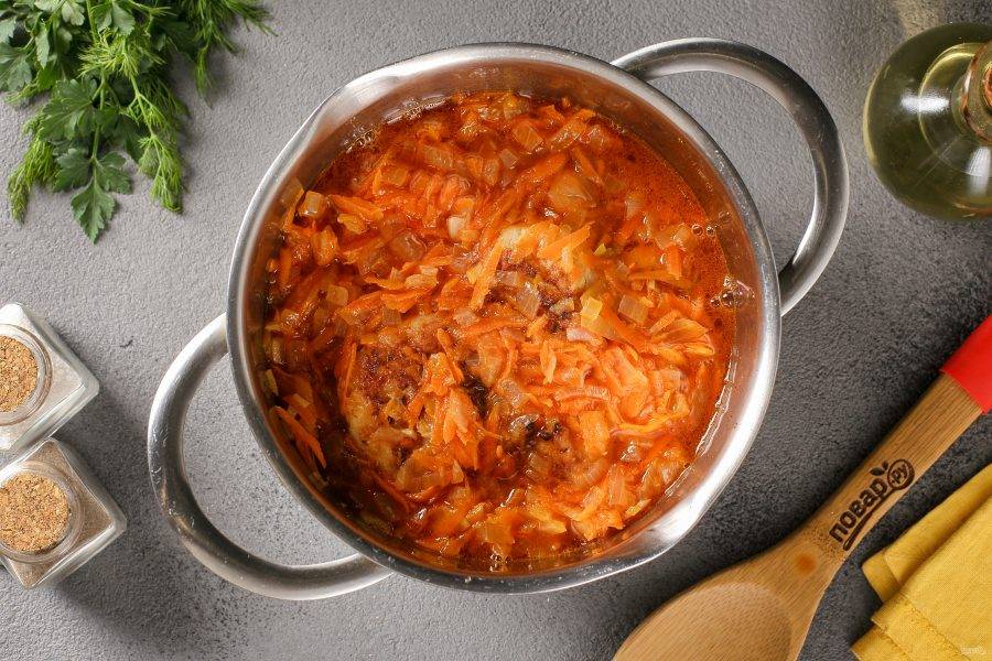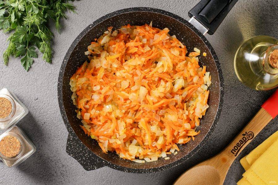 Оставшийся лук нарежьте кубиками. Морковь натрите на тёрке. Обжарьте овощи в сковороде до мягкости.