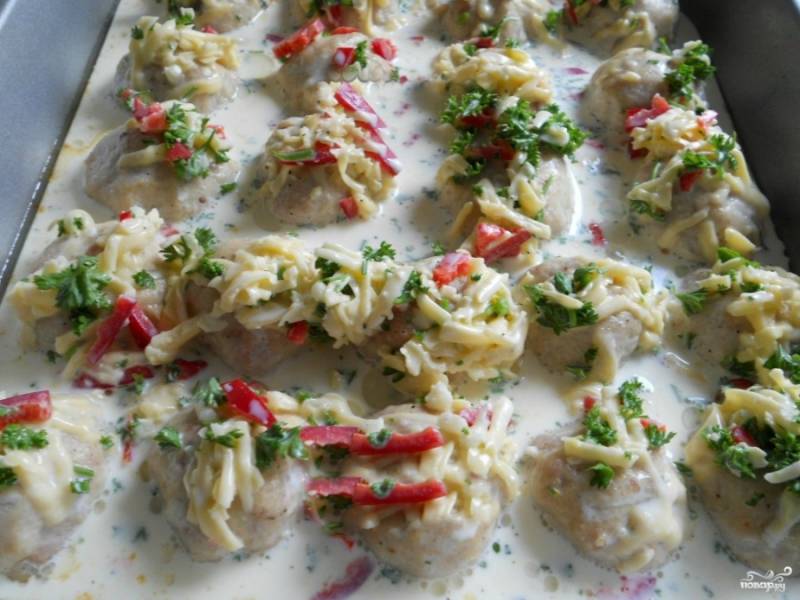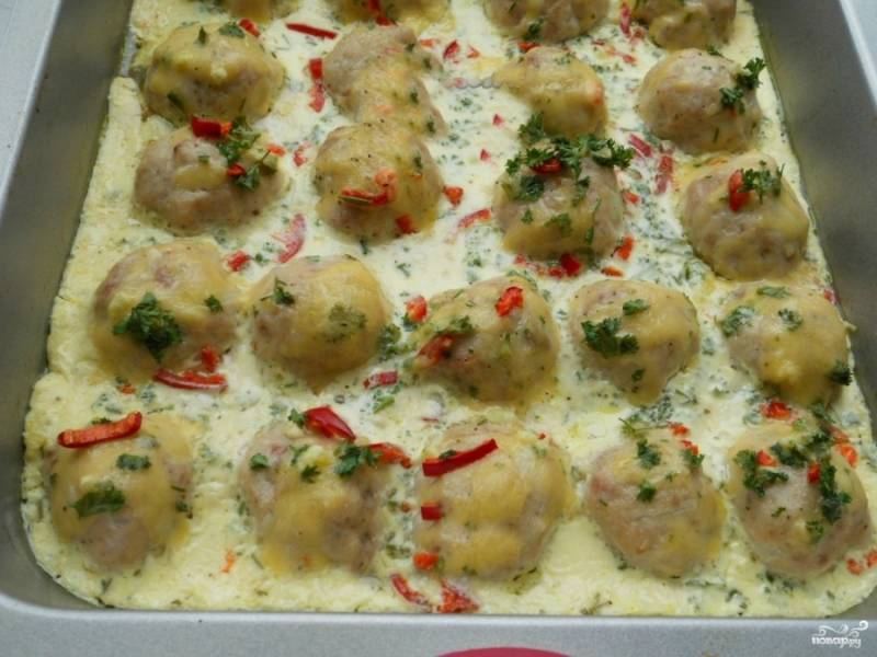 Тефтели вынимаем из духовки и заливаем готовым соусом. Затем отправляем форму обратно отправляем в духовку, готовим еще в течение 20 минут.