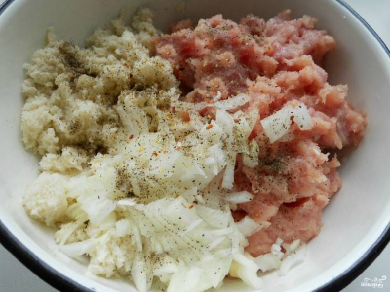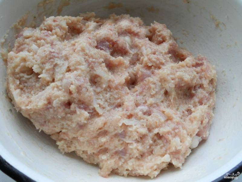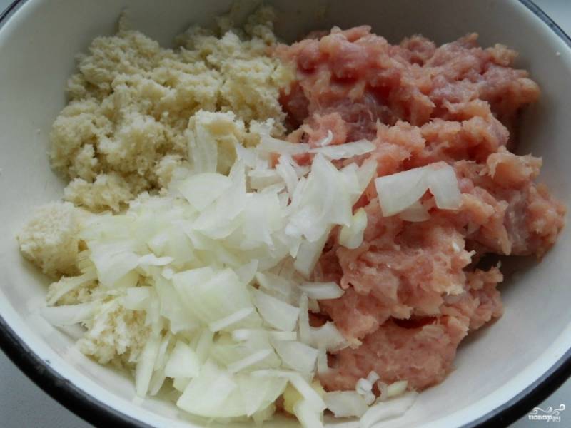 Хлебную мякоть замачиваем в подготовленном молоке. Свинину и филе пропускаем через обычную мясорубку или же измельчаем в блендере. К полученному фаршу добавляем лук и замоченный хлебный мякиш.