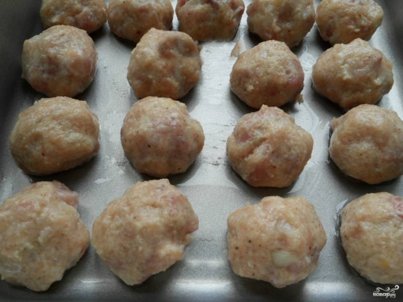 Формируем небольшие тефтельки, выкладываем их на форму для запекания, которую предварительно смазываем маслом. Запекаем тефтели в течение 15 минут при температуре 180 градусов.