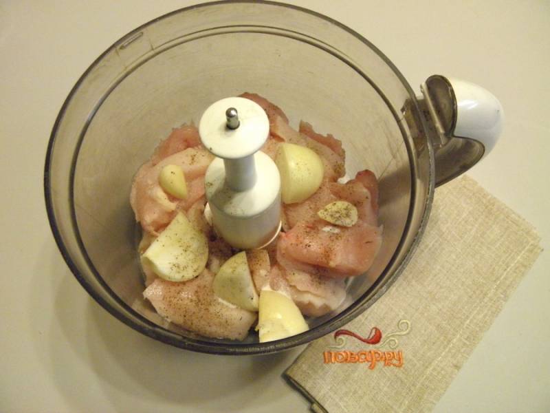 2. Куриное филе порежьте на кусочки, сложите в блендер и измельчите с луком, чесноком, солью и перцем молотым.