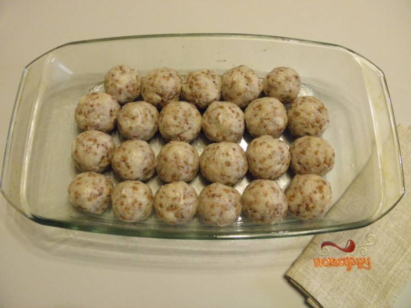 4. Сформуйте тефтели небольшого размера. Я набирала фарш чайной ложкой и катала шарики мокрыми руками. Сложите тефтели в глубокий противень.