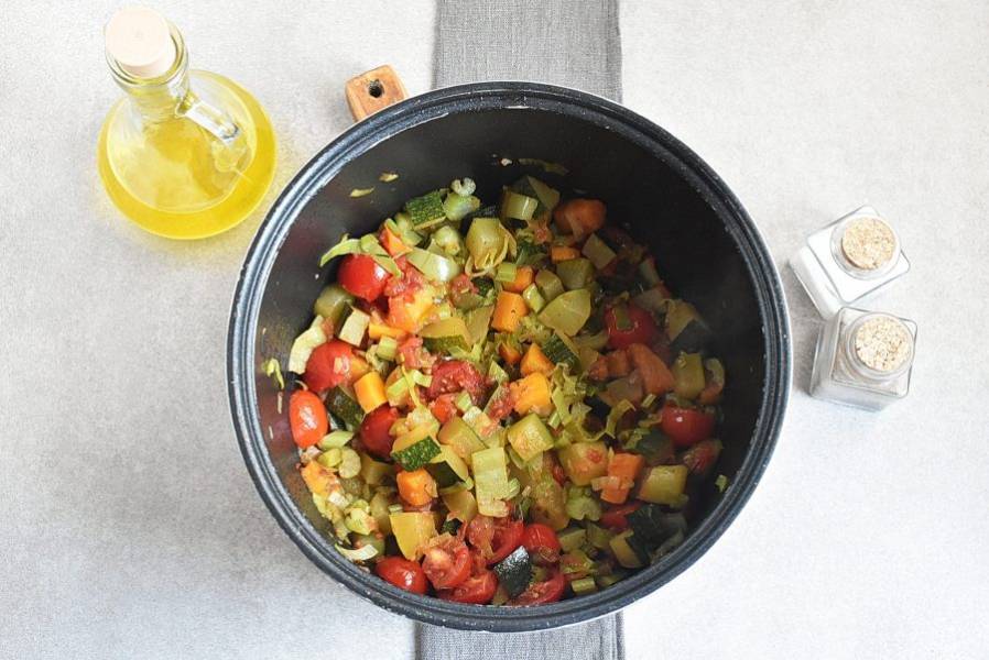 Полейте все измельченными помидорами. Переведите мультиварку в режим "Тушение" на 10 минут.