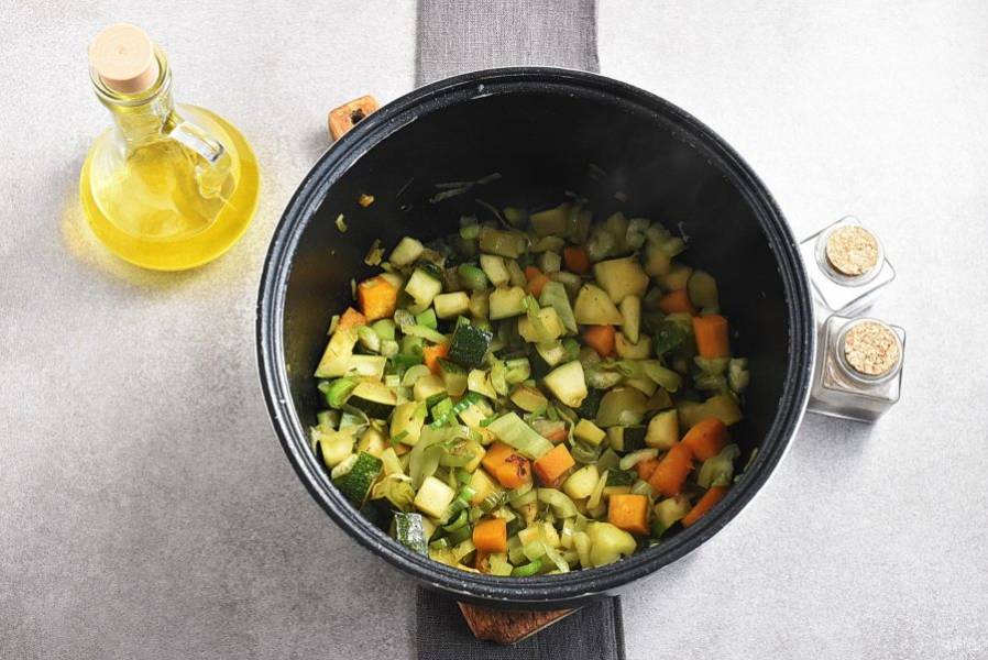 В чашу выложите овощи, кроме помидоров, и обжарьте 5 минут.