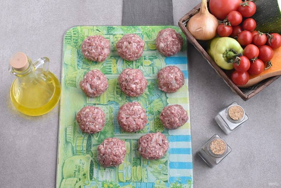 Смешайте фарш с мелкорубленным репчатым луком, натертым батоном, солью и перцем. Тщательно вымесите смесь и отбейте о дно миски раз 10.