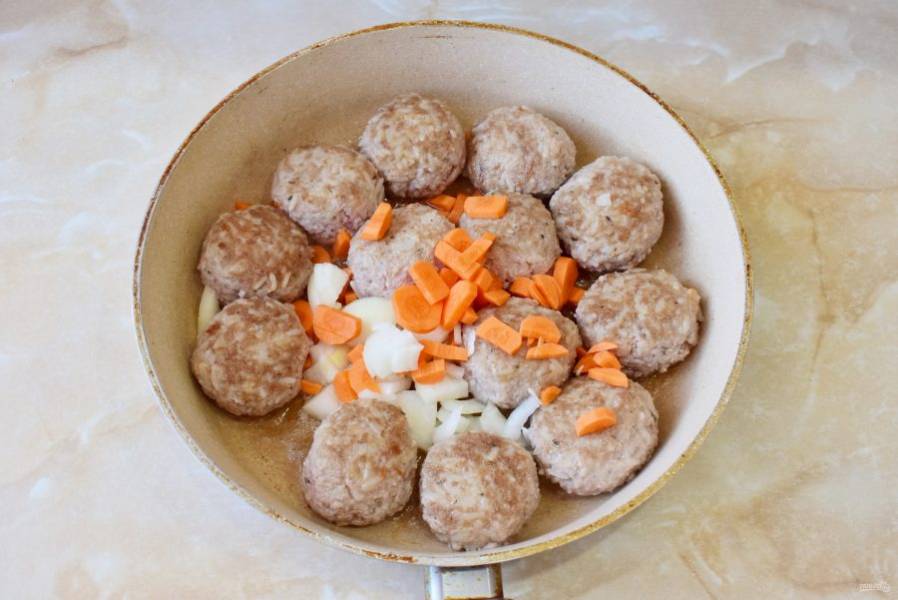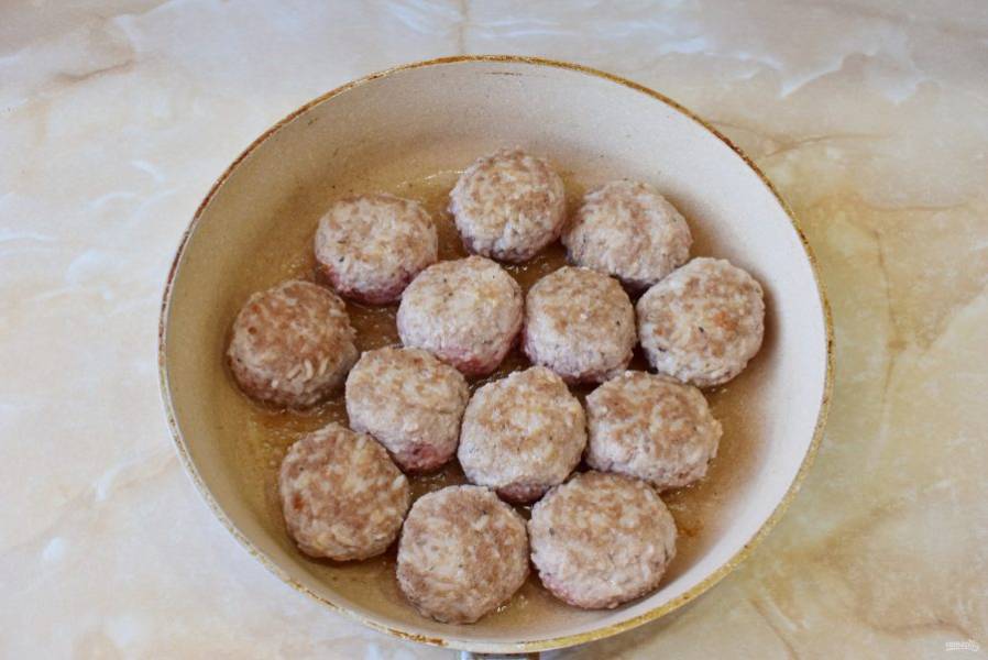 В горячую сковороду налейте немного растительного масла. Слепите тефтели и обжарьте их со всех сторон, чтобы мясо изменило цвет.