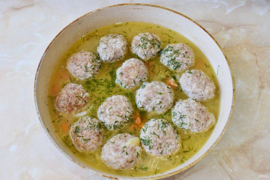 Тефтели с бульоном разложите по тарелкам и подавайте к столу. Приятного аппетита!