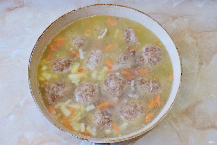 Затем все залейте горячей водой. По вкусу подсыпьте соль и специи. Доведите до кипения и готовьте под крышкой 15 минут. За счет того, в тефтелях много мяса, бульон получится достаточно наваристый и сытный.