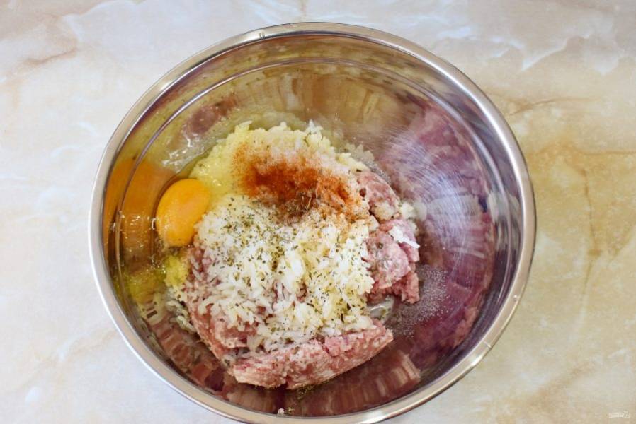 В чаше соедините мясной фарш и отварной рис. Разбейте яйцо. По вкусу подсыпьте соль и специи. Все смешайте. Мясную массу отбейте о дно чаши, чтобы сделать её плотнее. Благодаря этому тефтели не будут разваливаться при приготовлении.