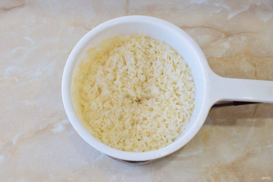 Рис предварительно отварите в кипящей подсоленной воде до мягкости. На это примерно уйдет 7-10 минут. Готовый рис откиньте на дуршлаг и пролейте холодной водой.