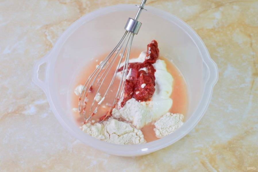 Для соуса соедините сметану с томатной пастой. Добавьте муку и воду. Все смешайте.