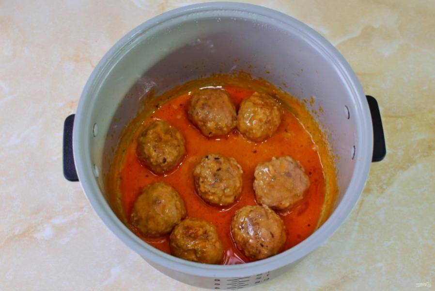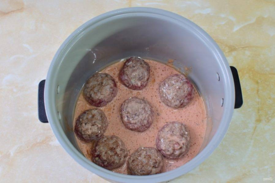 Затем залейте тефтели получившимся соусом. Закройте крышку и переключите мультиварку на режим "Запекание" на 25 минут.