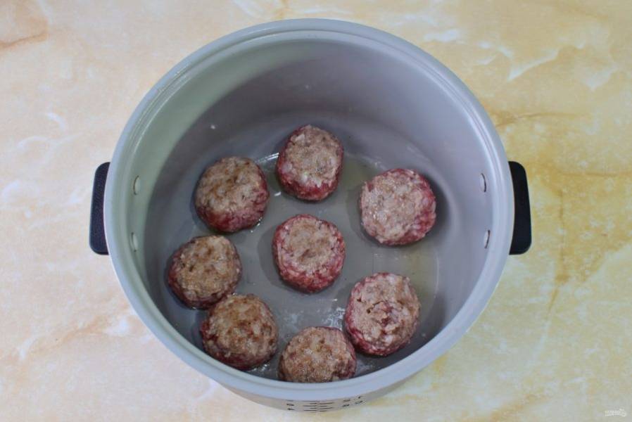 Включите мультиварку на режим "Жарка". В горячую чашу налейте растительное масло. Сформируйте тефтели и выложите их в чашу. Обжарьте в течение минуты, чтобы мясо поменяло цвет.
