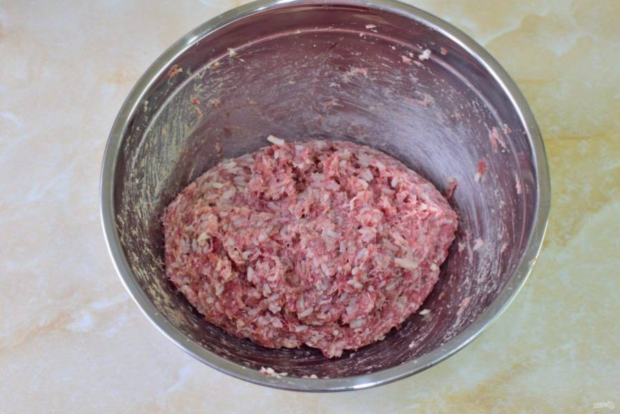 Все ингредиенты тщательно перемешайте. Мясную массу отбейте о дно чаши, чтобы сделать её плотнее.