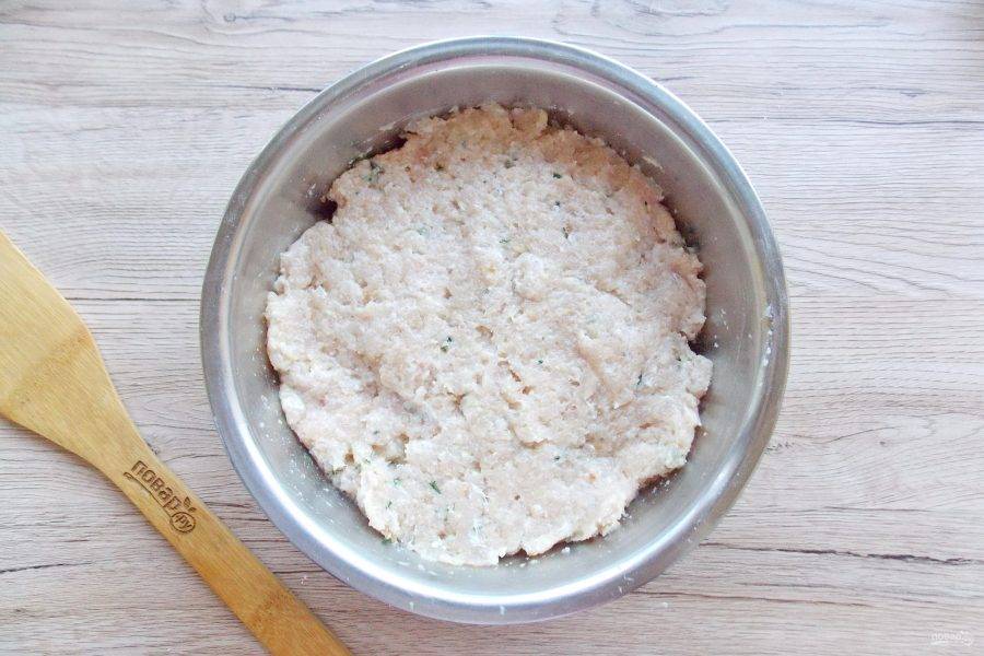 Фарш посолите, поперчите по вкусу и тщательно перемешайте. Можно добавить немного зелени.