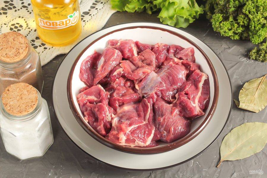 Телячьи щечки пронизаны жилами, но это только на первый взгляд. На самом деле это не жилы, а сальные прожилки, которые при длительном тушении подарят мясу сочность и бархатистый вкус. Поэтому их не вырезайте. Нарежьте щечки порционными кусочками и промойте.